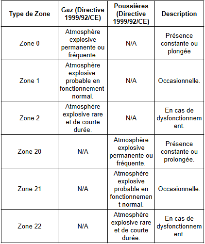 | Zone 21 | N/A | Atmosphère explosive probable en fonctionnement normal | Occasionnelle |